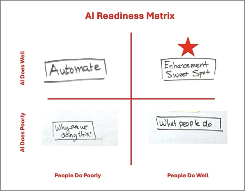 One of the tools we used in the workshop was a simple but highly effective 2x2 matrix that focuses attention on what AI is good at, what humans are good at, what they can effectively collaborate on, and what we should probably stop doing entirely. It’s a great way to focus on value creation and temper the hype with meaningful choices.